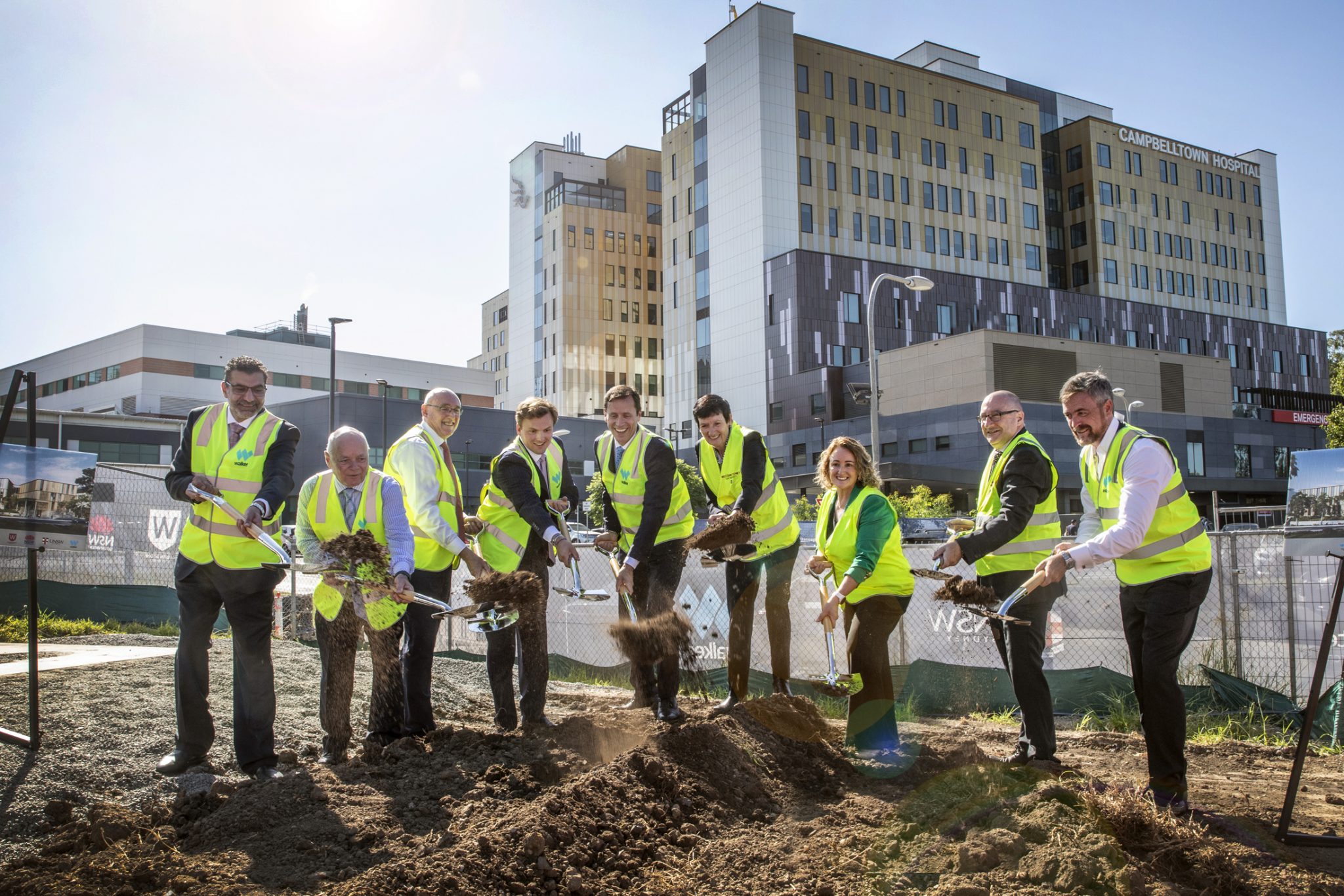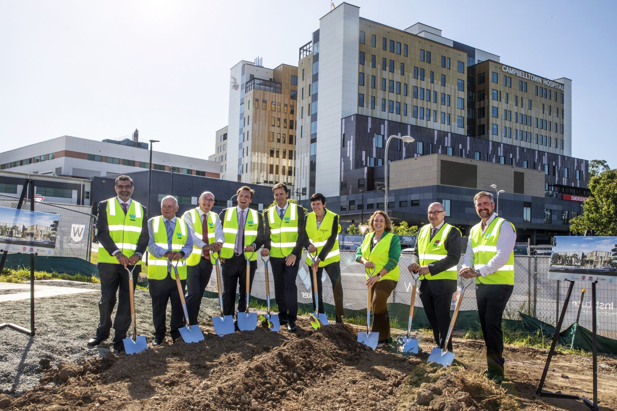 (Left to right) Campbelltown Mayor, Dr George Greiss; Terry Goldacre, Chairman, Ingham Institute for Applied Medical Research; Western Sydney University Vice-Chancellor and President, Professor Barney Glover AO; Walker Assistant Development Manager Hugo Walker; Walker Managing Director and Chief Executive Officer David Gallant; Western Sydney University Chancellor, Professor Jennifer Westacott AO; SWSLHD Chief Executive, Sonia Marshall; General Manager, Camden and Campbelltown Hospitals, Grant Isedale; and UNSW’s Vice-Chancellor and President, Professor Attila Brungs.